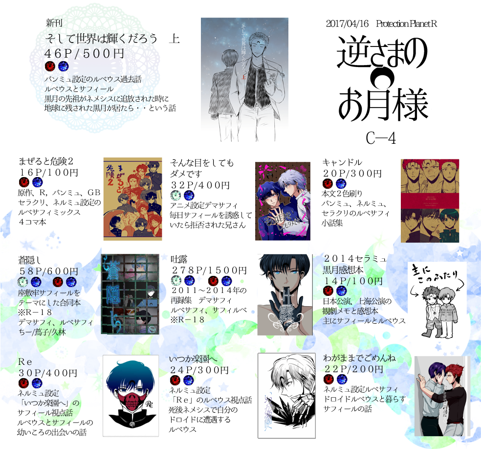 既刊は持ち込み数少なめにするので取り置き希望の方いらっしゃいましたらtwiiterかpixivかメールフォームからご連絡ください